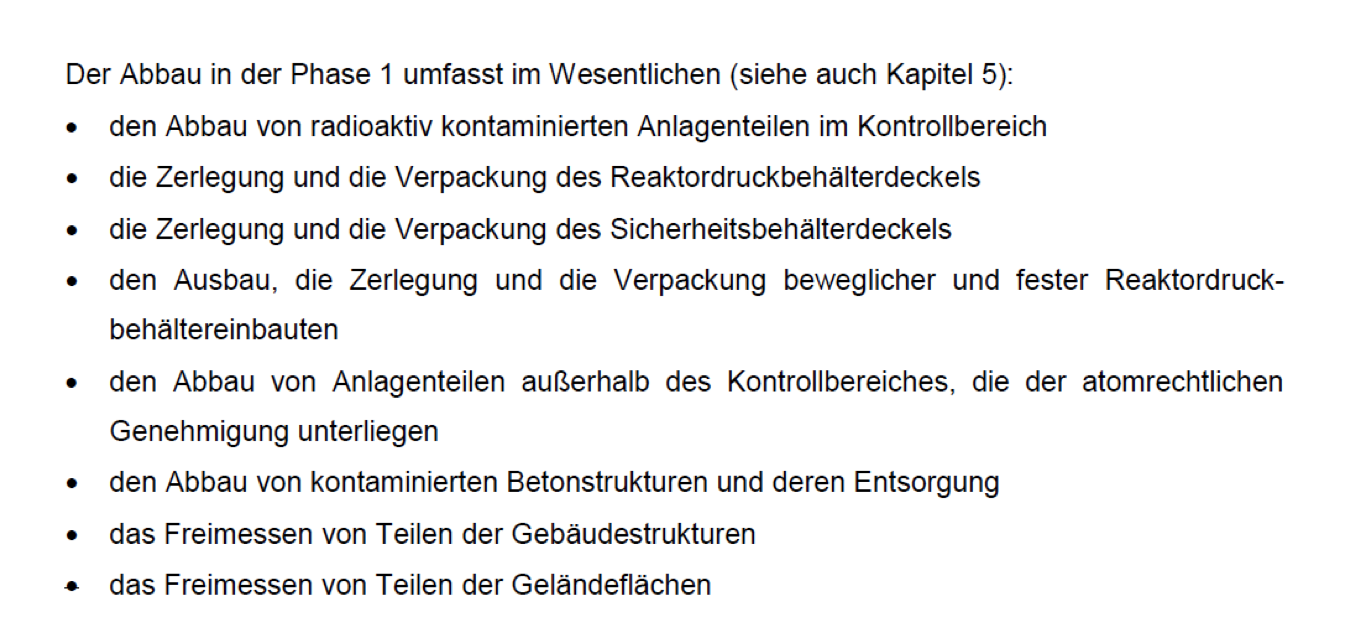 Auf die Tatsache, dass noch 1700 abgebrannte Brennelemente im Abklingbecken liegen, nimmt E.ON nur beschränkt Rücksicht. Bereits in Phase 1 sind verschiedene Maßnahmen geplant, die innerhalb des Kontrollbereichs liegen: