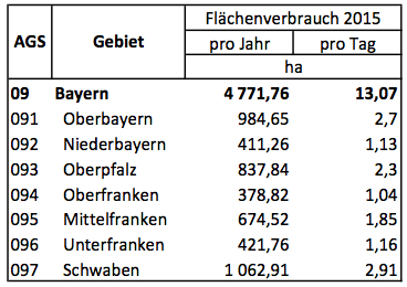 Zum Stichtag 31. Dezember 2015 waren 11,9 Prozent der Gesamtfläche Bayerns durch Siedlungs- und Verkehrsfläche beansprucht. Täglich werden in Bayern 13,1 ha (Hektar) Freifläche in Siedlungs- und Verkehrsfläche umgewandelt. Damit überschreitet der tägliche Flächenverbrauch zum Stichtag 31.12.2015 erstmals seit Umstellung der Flächenerhebung auf die Datengrundlage des Amtlichen Liegenschaftskataster-Informationssystems (ALKIS) den Wert von 13 ha. Bayern liegt mit diesem Wert im Hinblick auf den täglichen Flächenverbrauch an der Spitze aller alten Bundesländer.
